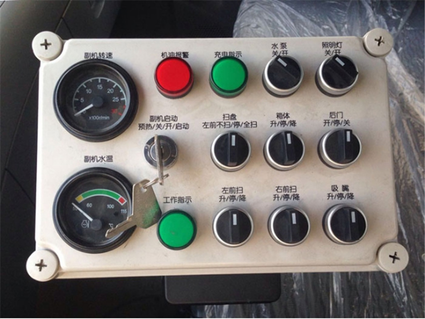 9,一鍵PLC操作控制面板設(shè)計(jì),方便司機(jī)工作時(shí),在駕駛室內(nèi)就可以完成吸盤的收放,水路控制,垃圾傾倒和垃圾箱回位操作。