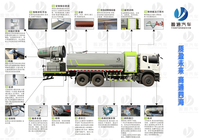 天龍23方霧炮車_東風(fēng)天龍霧炮車_國六23方霧炮車_天龍23方水罐車_湖北盈通專用汽車有限公司,該車用途為抑塵降霾,主要裝置為罐體及噴霧裝置;隨底盤選裝駕駛室,選裝噴霧裝置樣式;罐體有效容積:14立方米,罐體外形尺寸(長×長軸×短軸)(mm):5000×2400×1700;側(cè)、后防護(hù)材料均為:Q235碳鋼,連接方式均為:螺栓連接,后部防護(hù)截面尺寸(mm):120×50,后部防護(hù)離地高度(mm):480;ABS型號(hào)/生產(chǎn)廠家:3631010-C2000/東科克諾爾商用車制動(dòng)系統(tǒng)(十堰)有限公司,ABS 8/東科克諾爾商用車制動(dòng)系統(tǒng)(十堰)有限公司,4460046450/威伯科汽車控制系統(tǒng)(中國)有限公司.安裝120霧炮時(shí),后伸930mm,對(duì)應(yīng)整車長度為11580mm。隨底盤選裝底盤布置. |