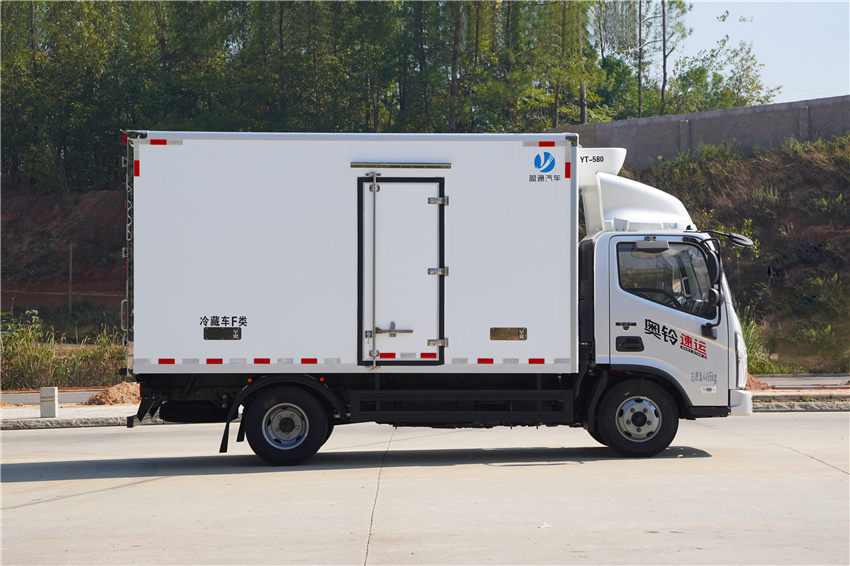 奧鈴速運冷藏車采用福田康明斯131/150/156馬力(F2.8NS6B131/F2.8NS6B150/F2.8NS6B156發動機,采埃付5變速箱,NPR沖壓后橋(帶制動襯片磨損報警),7.00R16輪胎,斷氣剎、單排翻轉、車載無線服務控制器(T-BOX)、ABS、離合助力、動轉,